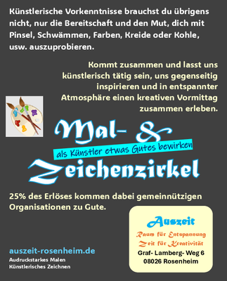 In einer geselligen Runde voneinander zu lernen, sich über seine Vorstellungskraft hinaus trauen, einfach mal ohne Plan drauf los arbeiten, spüren was der Pinsel heut aus mir zaubert, erwartungslos den Prozess annehmen und Spaß am kreativen Schöpfen zu haben, sind die wichtigsten Voraussetzungen für ein freies Schaffen in der AUSZEIT.